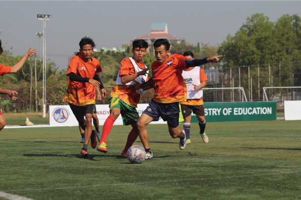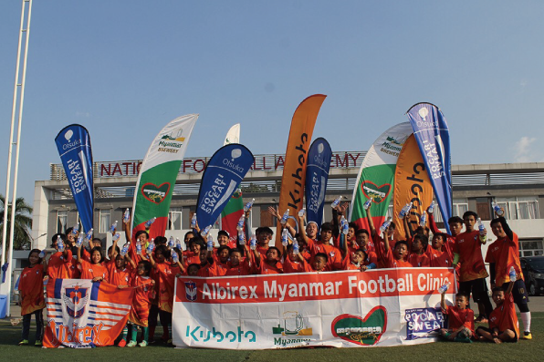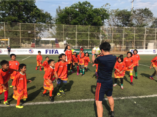 午後からはヤンゴンにある養育施設Dream Trainの子どもたちです。この子どもたちにはバスを手配し、ミャンマーサッカー協会のアカデミー施設に来てもらいました。いつもプレーする学校の土のグランドではなく、整備された人工芝でのプレーということで、子どもたちはいつも以上にワクワクしていました。