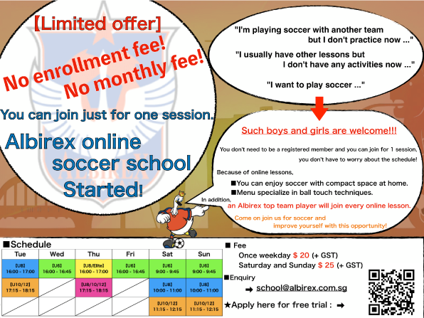 【School School】No enrollment fee! No monthly fee! You can join just for one session. Albirex online soccer school started!