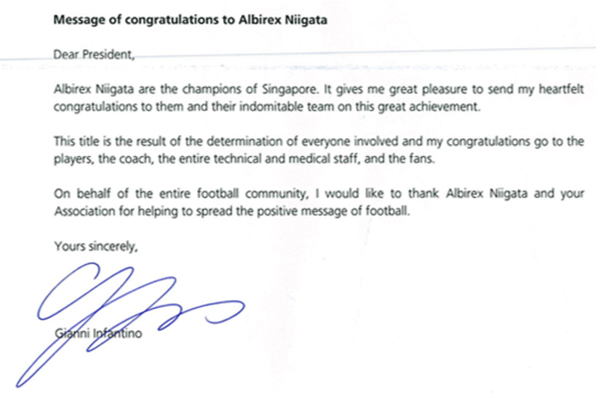 Message of Congratulations from FIFA President, Gianni Infantino. Media2016/10/26 -