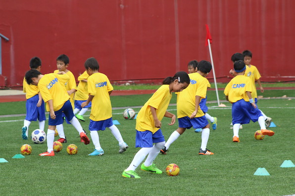 まず最初にエジミウソン氏より挨拶とトレーニングの説明をいただき、さっそく練習開始。ジュロンイーストスタジアムに区切られた9つのスペースを使って、子供たちは存分に身体を動かしました。小さな1号球を使ったドリブルやキック練習などの基本練習から始まり、後半は3種類のゴールを使ったゲーム。とにかくサッカーを楽しむことが大切と述べるエジミウソン氏は、頻繁に子供たちに声をかけ、自ら身体を使って指導していました。