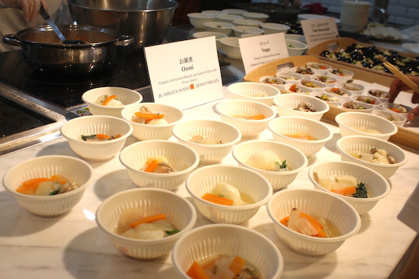 その後は、新潟の家庭料理「のっぺ」やお餅料理、新潟和牛など、新潟産の食材をふんだんに使用した料理が振舞われ、新潟の日本酒やワインとともご参加いただいたみなさまに試食いただきました。試食後には、新潟から来星された企業様と飲食関係者のみなさまの商談も積極的に行われた様子です。