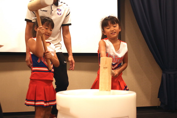 さらに、スペシャルゲストとしてアルビレックス新潟で9年間プレーした野澤洋輔選手とアルビレックス新潟U-18出身の鎌田啓義選手が登場、餅つきで新潟のお米をPRいたしました。