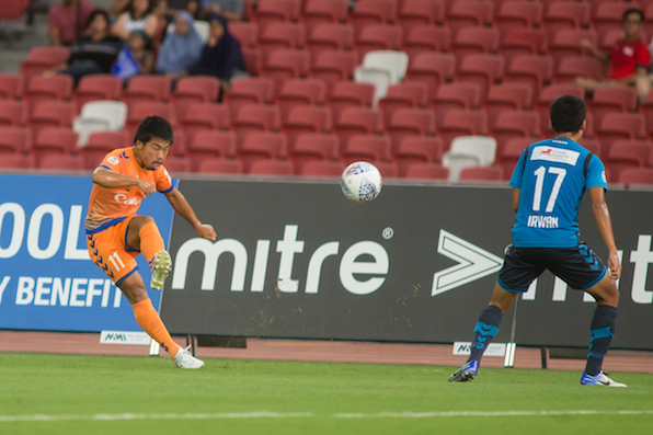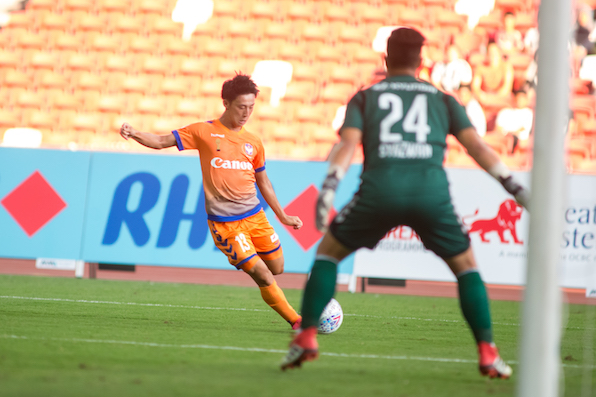 45分、タンピネスの左サイドからクロスはファーサイドで合わされるが、ヘディングの体勢が悪くミートせずにピンチを逃れる。