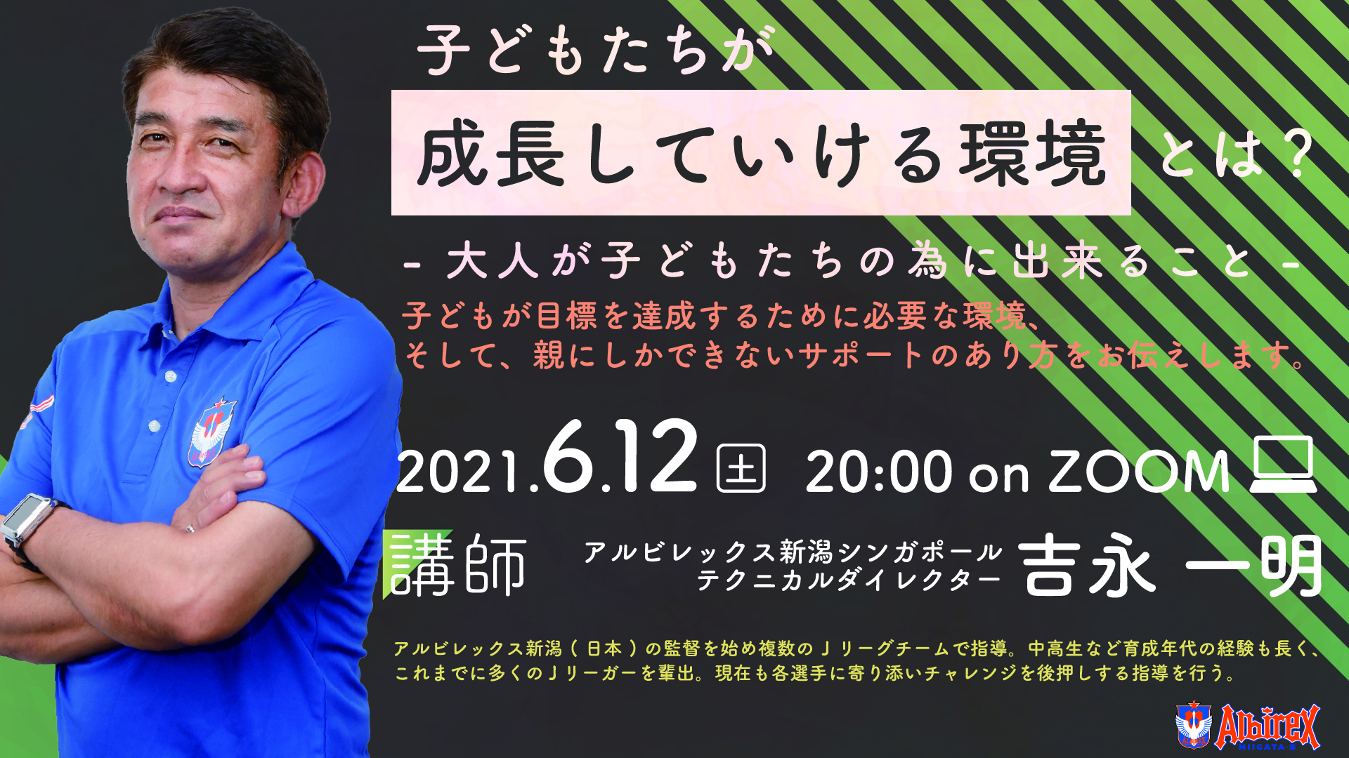 本講演では、当クラブテクニカルダイレクターの吉永一明が講師となり、日々成長を続ける子どもに対し、親としてどのようなサポートができるのか、またどのように環境を整えていけば良いのかをお話しいたします。