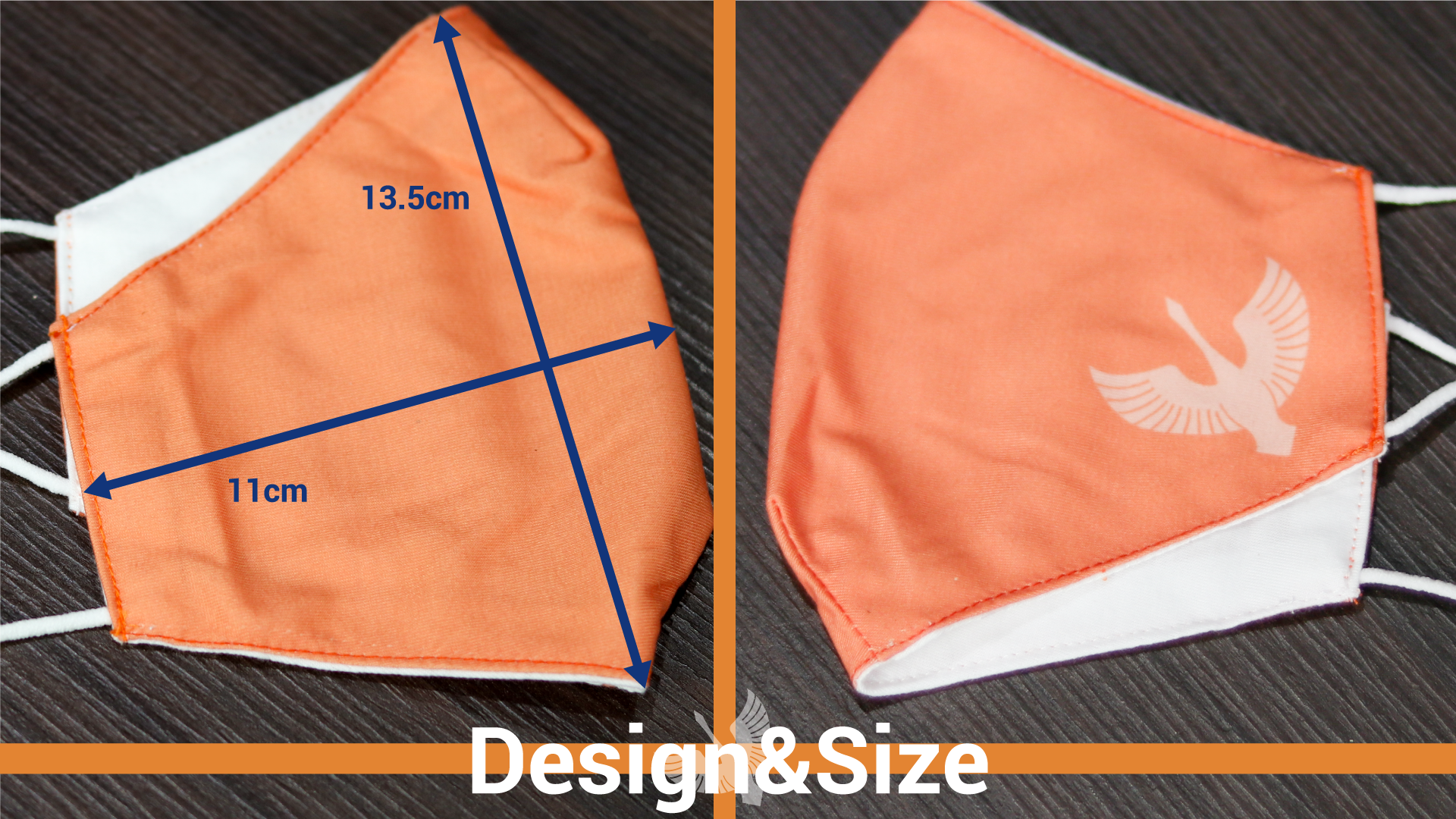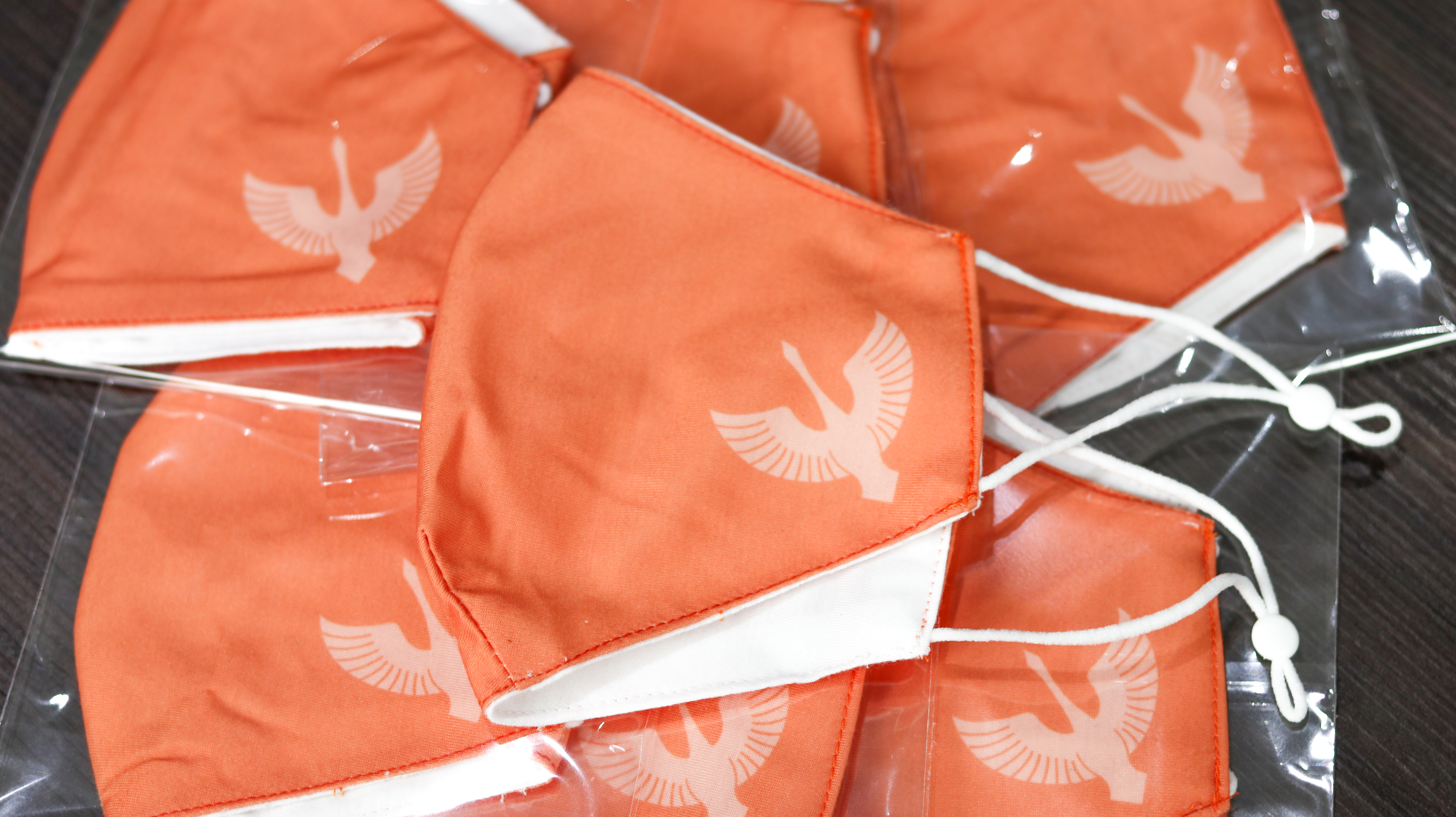淡いオレンジ色をベースカラーに、クラブエンブレムの白鳥シルエットをプリントしました。 マスク紐にはアジャスターがついており、長さは自由に調節可能です。
