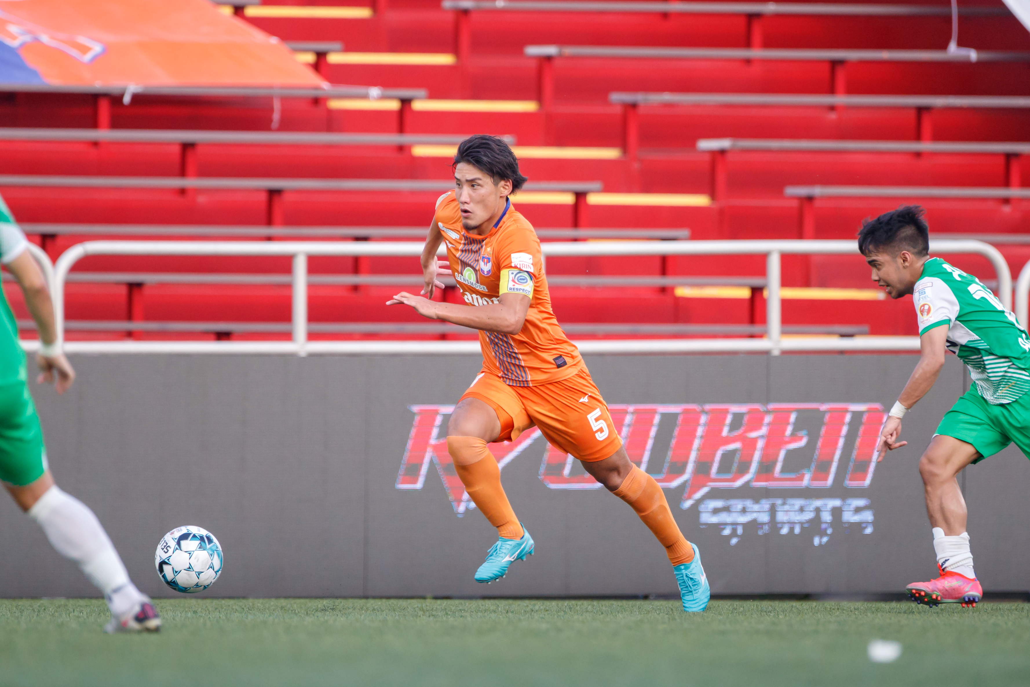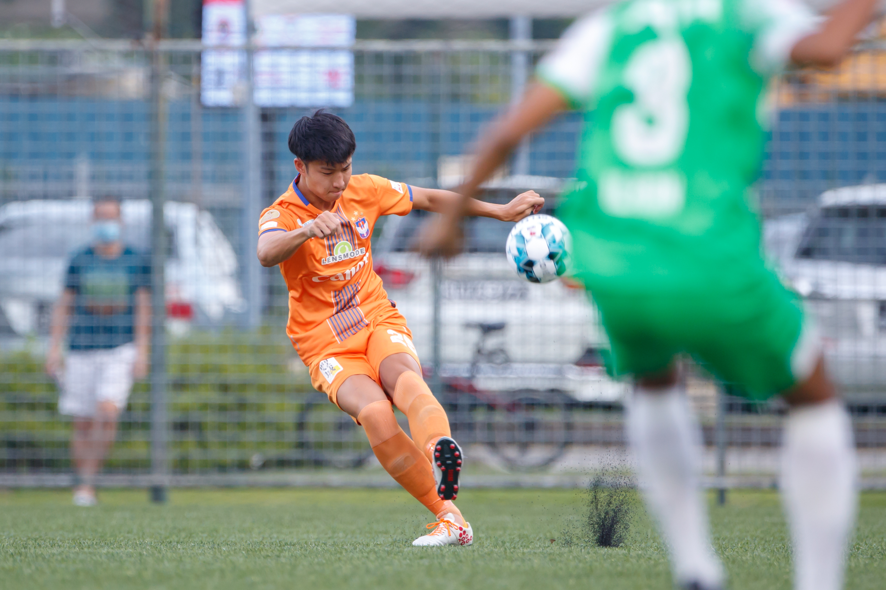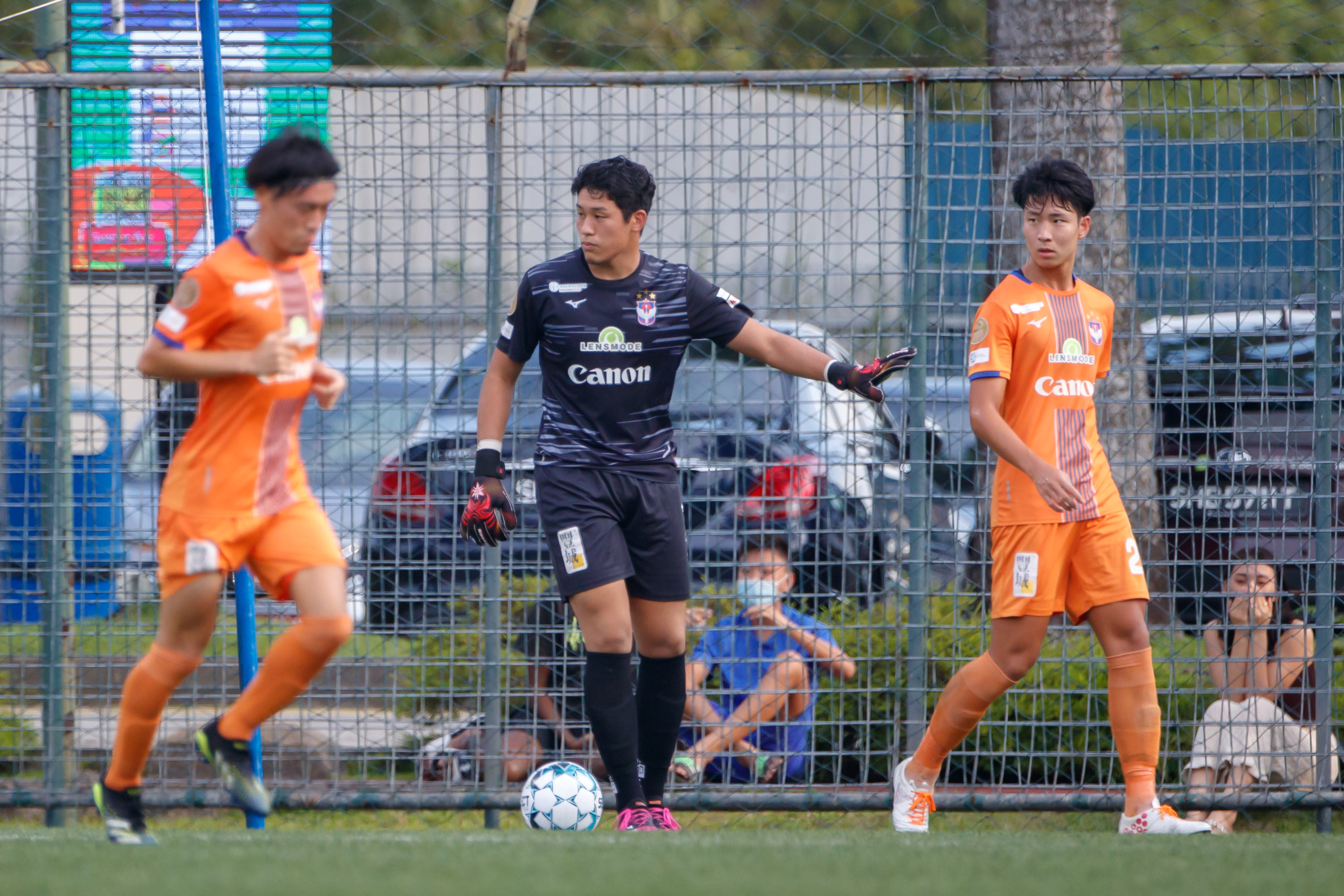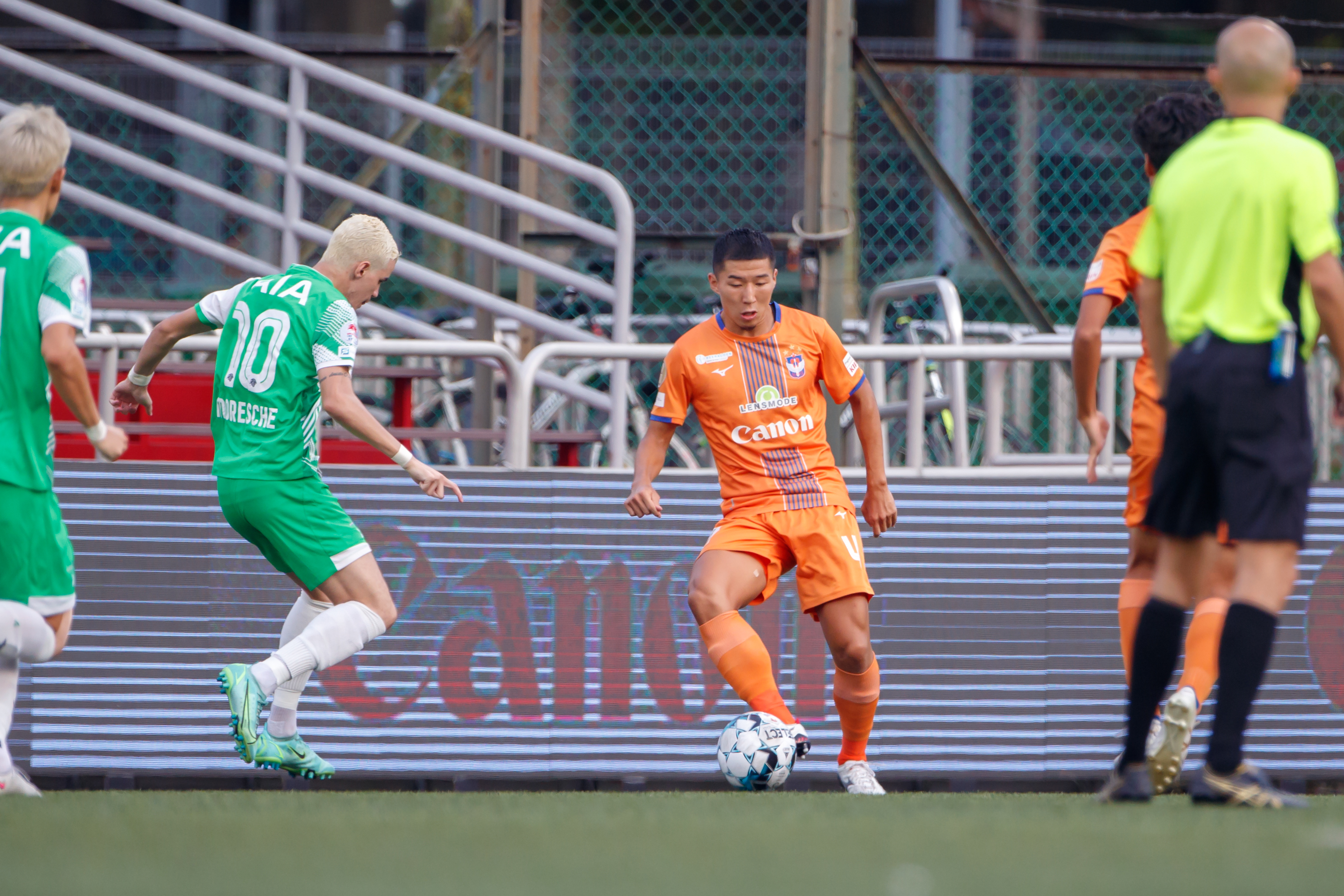 続く4分、国本選手のロングパスに抜け出したフィクリ選手が倒されFKを獲得すると、知久選手が直接狙います。壁を越えるシュートはわずかに落ち切らず、ポストに弾かれます。