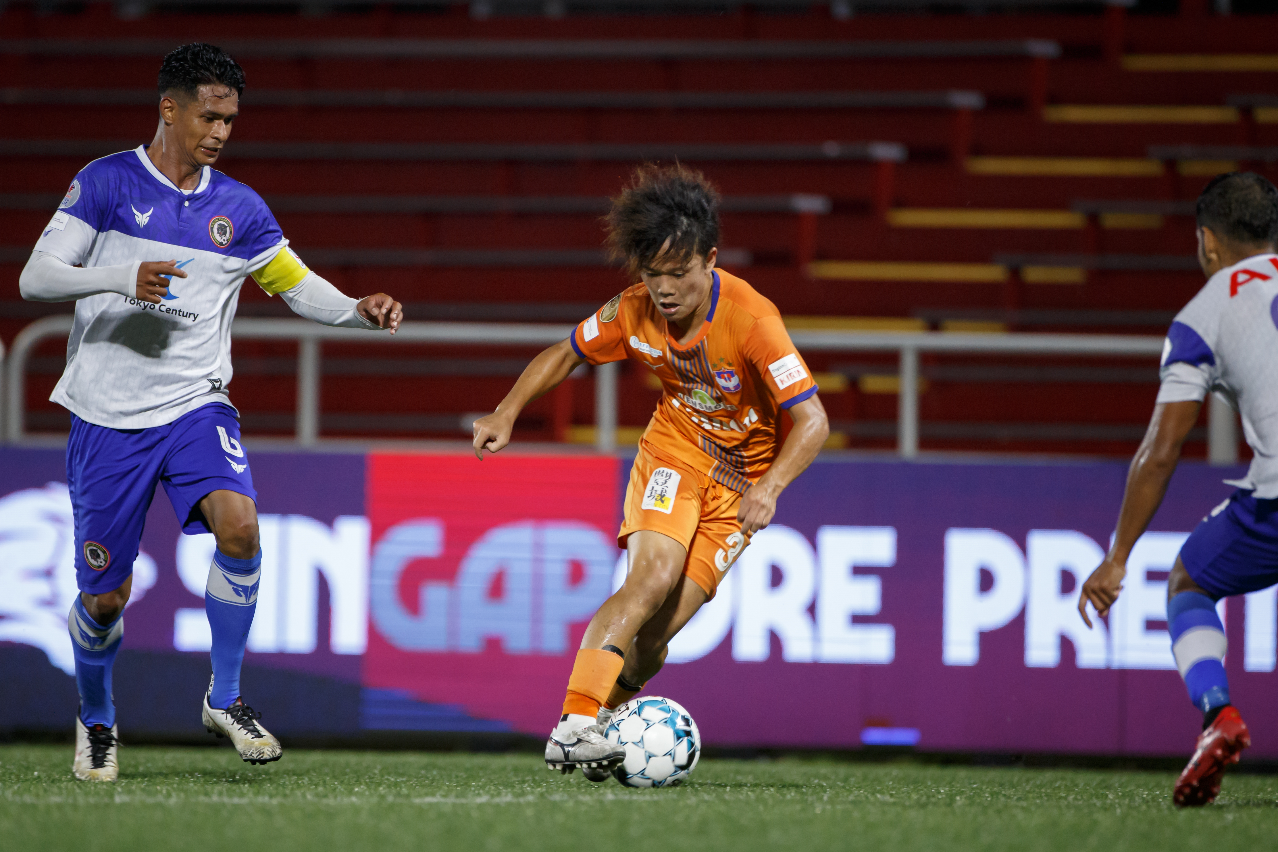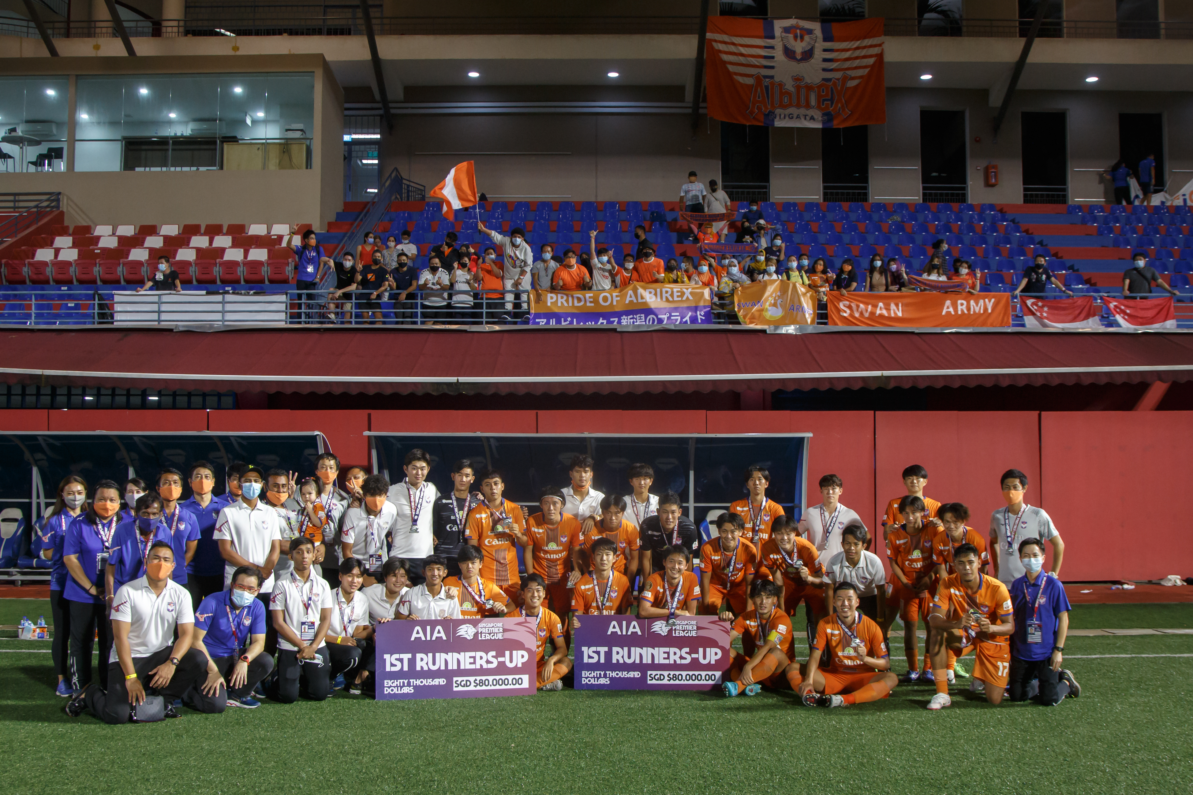 優勝を信じアウェイ側スタンドを埋め尽くしたアルビSサポーター、そしてチームのプライドをかけて戦うタンジョンパガー サポーターによる大声援で、スタジアムが異様な雰囲気を醸します。