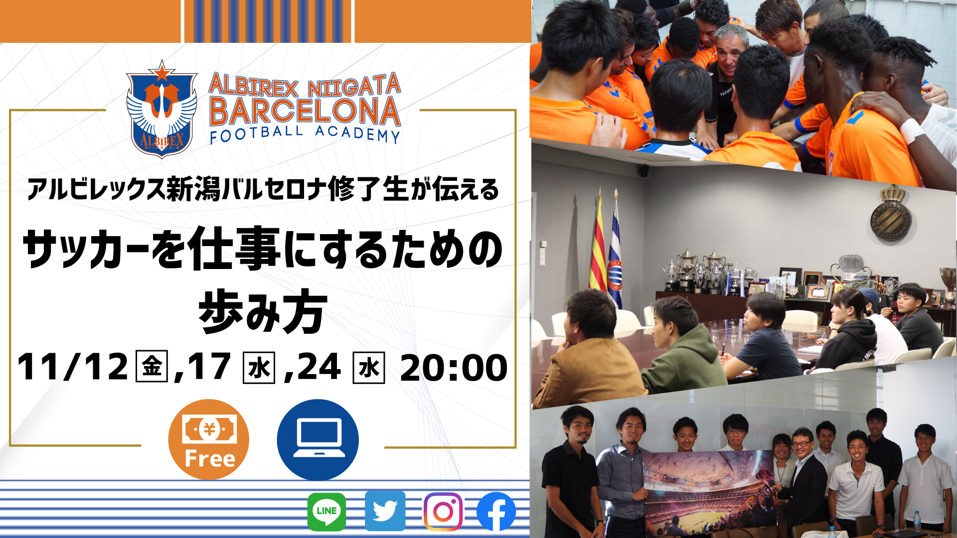 この度、アルビレックス新潟バルセロナ フットボールアカデミーでは、【アルビレックス新潟バルセロナ修了生が伝える『サッカーを仕事にするための歩み方』】を開催いたします。