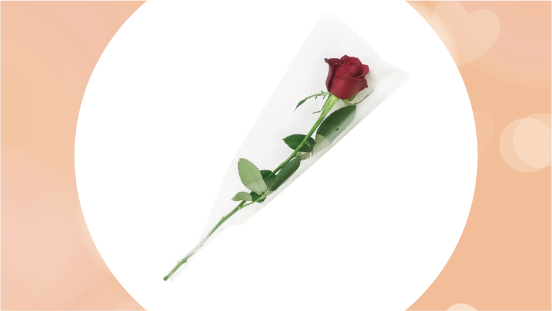 "Love" "Beauty"といった花言葉を持つ赤バラを一輪でラッピングしてお届けします。