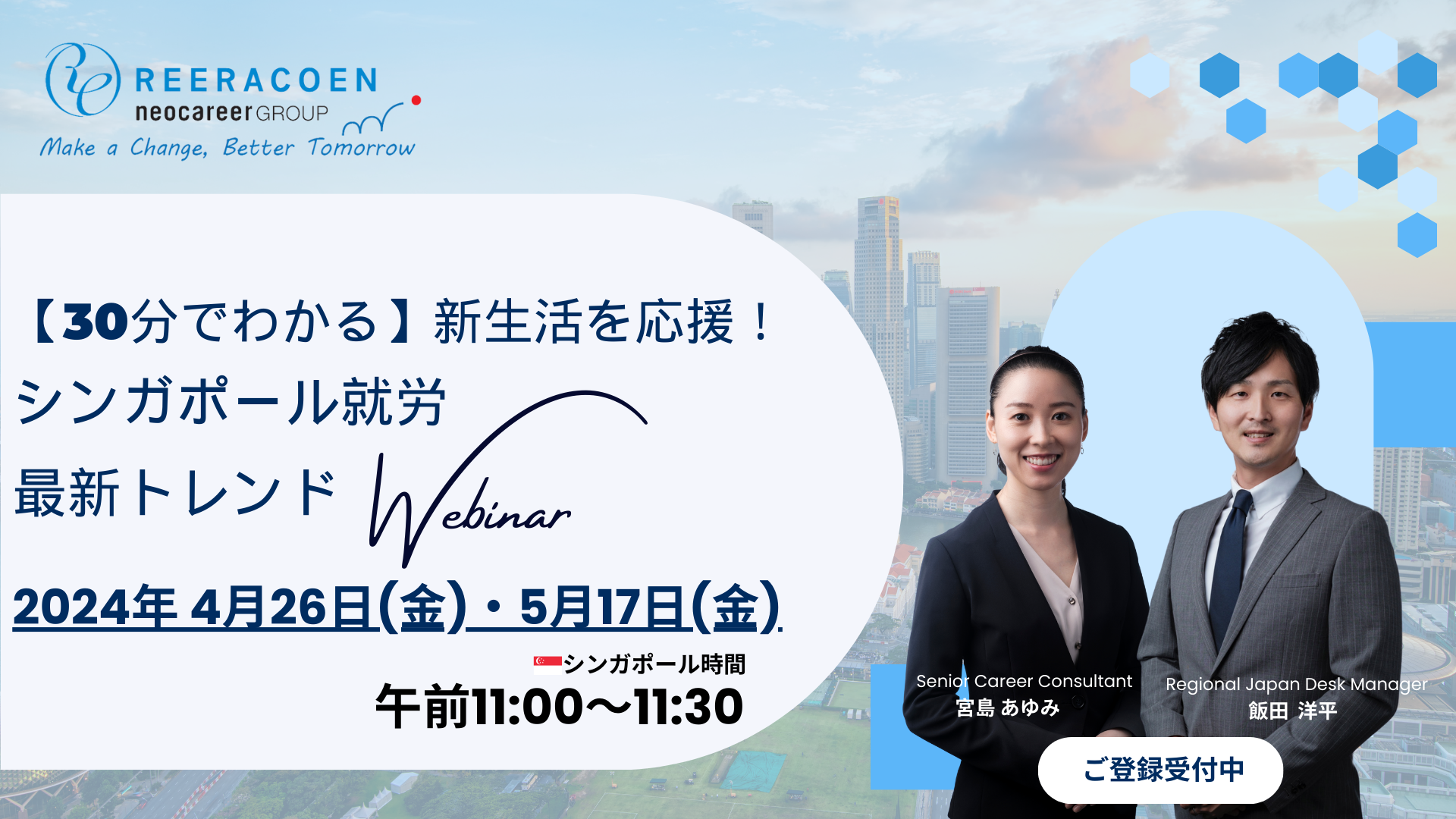 当クラブのオフィシャルパートナーであるReeracoen様ではこの春、シンガポールに渡星したばかりの方や、すでにお住まいの方で働くことを検討されている方へ、シンガポール就労に関する最新トレンド情報をお届けするウェビナーを開催いたします。 外国人が働くための就労ビザの基本やシンガポールの最新就労環境はもちろん、就労事例や最新求人情報など、今知っておきたい情報を丸ごと30分間で解説いたします。